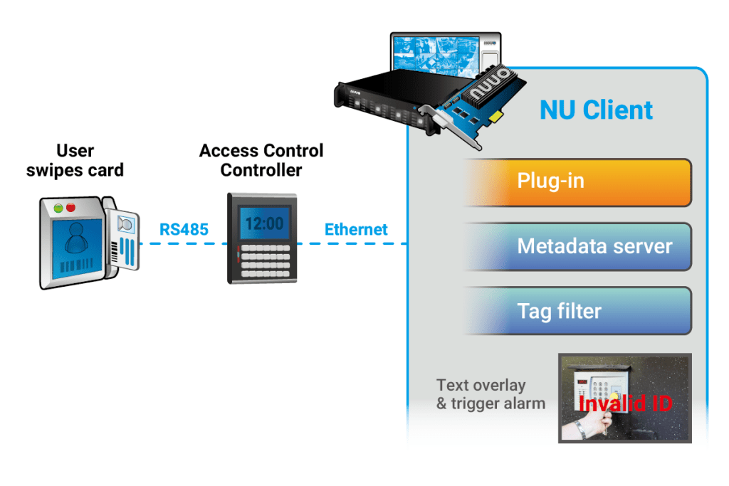 Access Control solution connects surveillance video with access control systems from 3rd party partners. Card ID, Door ID, and other information from the access control system can be displayed on live view or playback and used to trigger user-defined alarms.